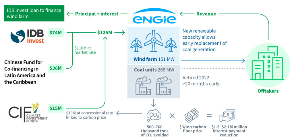 IDB Invest (the lender of record) structured and proposed a blended finance package, which incentivized EECL (the borrower) to retire operating coal assets early via a concessional debt tranche in the financing package. The loan financed the construction of new renewable generation rather than explicitly refinancing or retiring coal assets — however it was structured so that the earlier the operating coal assets were shut down, the lower the amount of interest of the concessional tranche EECL would need to pay at maturity of the loan. The amount of the interest rate reduction depends on a pre-agreed carbon price multiplied by a capped volume of carbon saved via early retirement. Additional details on the Tocopilla coal units can be found in Appendix Exhibit 1.1.
