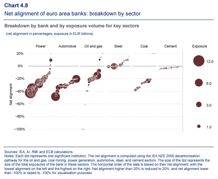 Exhibit 1: Screenshot from ECB report showing the extent of banks’ misaligned exposure to the power, automotive, and oil and gas sectors. These sectors drive the majority of the net misalignment of the portfolios analyzed, with the steel and cement sectors showing better alignment.