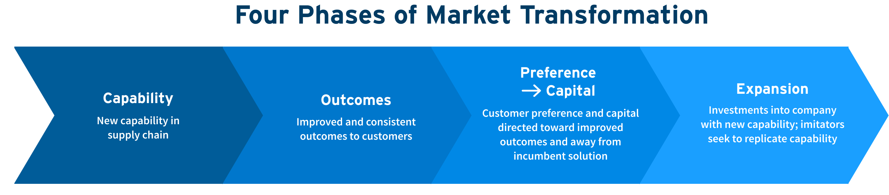 “Market transformation” refers to a marked shift from incumbent offerings to products and services that deliver better outcomes to consumers. W. Chan Kim and Renée Mauborgne call this “step change in value for buyers” the critical determinant of success for new markets. Better outcomes for consumers, or comparable outcomes at an appreciably lower price, stem from the development of new capabilities in the supply chain.