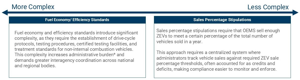 ZEV supply-side policies can vary in complexity. ZEV supply-side policies can be designed differently — some are more complex than others. Fuel economy and fuel efficiency standards represent a more complex regulatory framework. These policies often require the standardization of testing protocols, differing requirements by vehicle type, and the establishment of certified testing centers, leading to a high administrative burden. Consider the complexity level necessary for the market context in which the policy is being implemented.