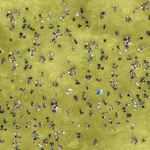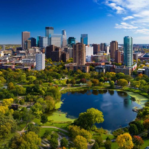 Minneapolis aerial with Downtown Minneapolis skyline in the background and Loring Park with Loring Pond in the foreground, during early autumn.