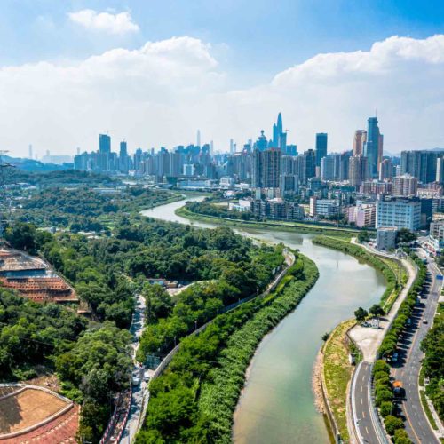 An aerial view of downtown cityscape in Shenzhen, China (Daytime)
