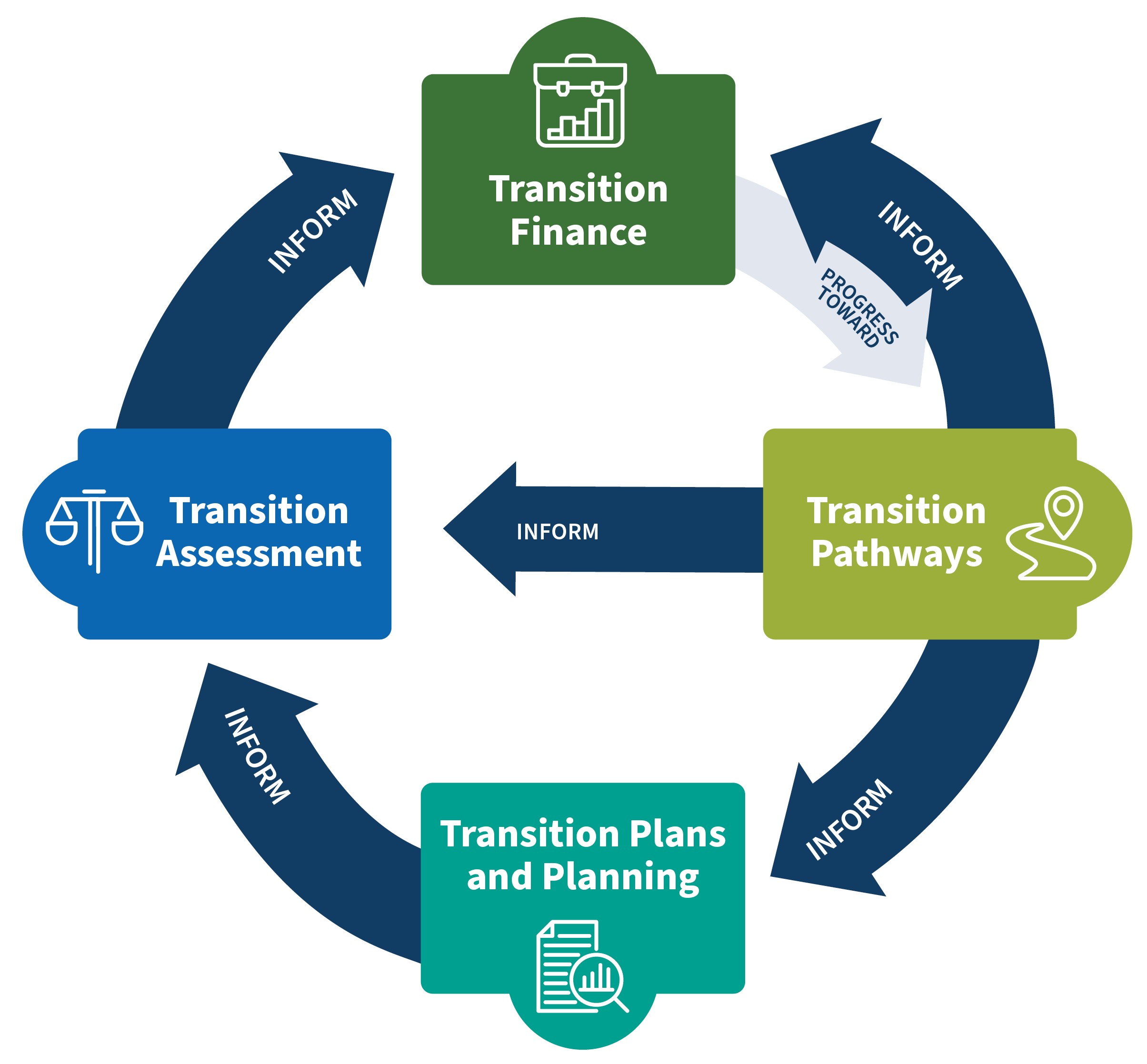 - Transition finance is enabled by other elements in the nexus and should, in turn, enable progress toward pathways, plans, and assessments over time. The nexus can therefore be a circular process for banks to deploy and scale transition finance.