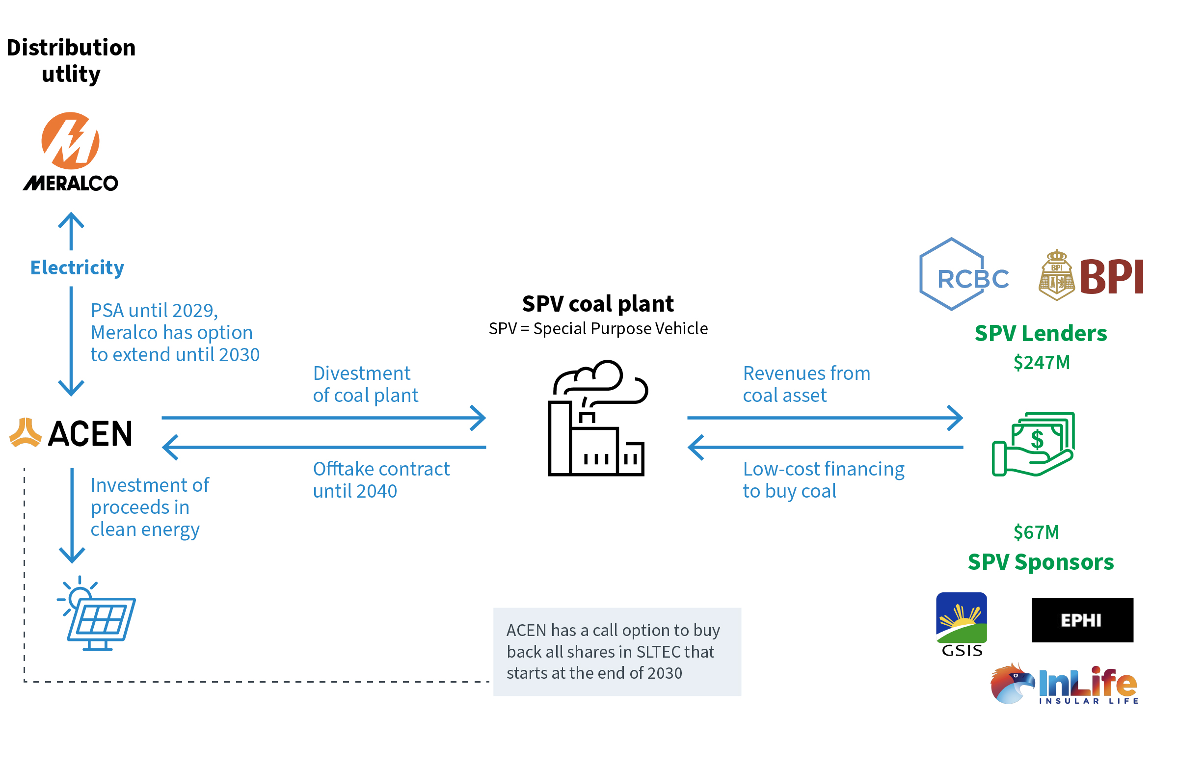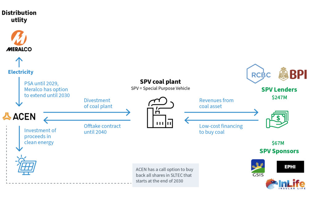 In 2022, ACEN Corporation (energy subsidiary of the Philippines-based conglomerate Ayala Corporation), offtaker of South Luzon Thermal Energy Corporation’s (SLTEC’s) coal plant, closed a deal to fully sell its equity in SLTEC and the plant to a special purpose vehicle (SPV) and thereby reduce the plant operating life by 25 years, to 2040.