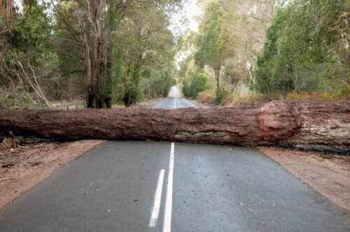 Following a storm, a large tree trunk blocking access on a road in Western Australia.