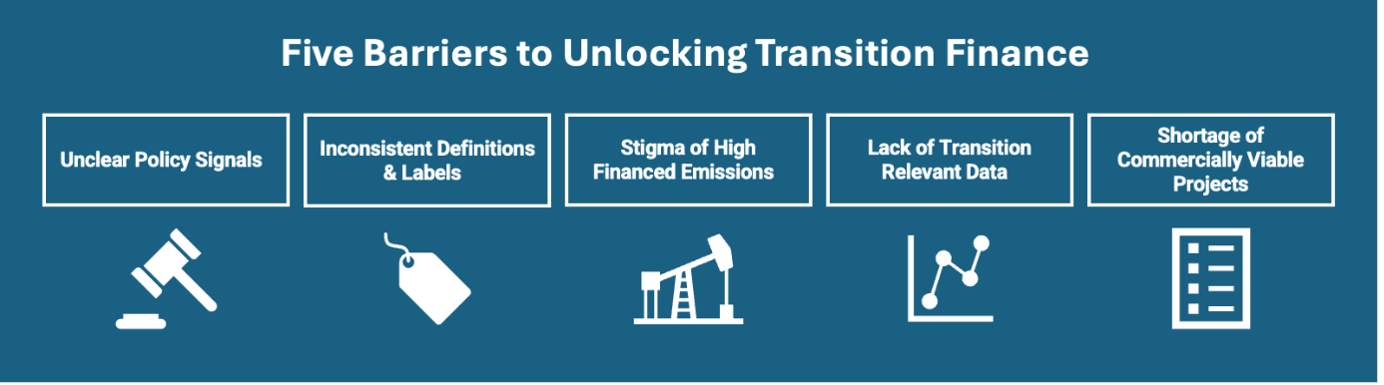 The barriers to transition finance are often connected and mutually reinforcing. This has arguably hindered progress — but the good news is that potential solutions are equally interrelated. If financial institutions and other stakeholders can make strides in overcoming one barrier, others are likely to fall too. For example, clearer policy-led incentives could help unlock additional bankable projects. Searching for force multipliers that reduce these barriers across the financial system could help rapidly scale the market for and allocation of transition finance.
