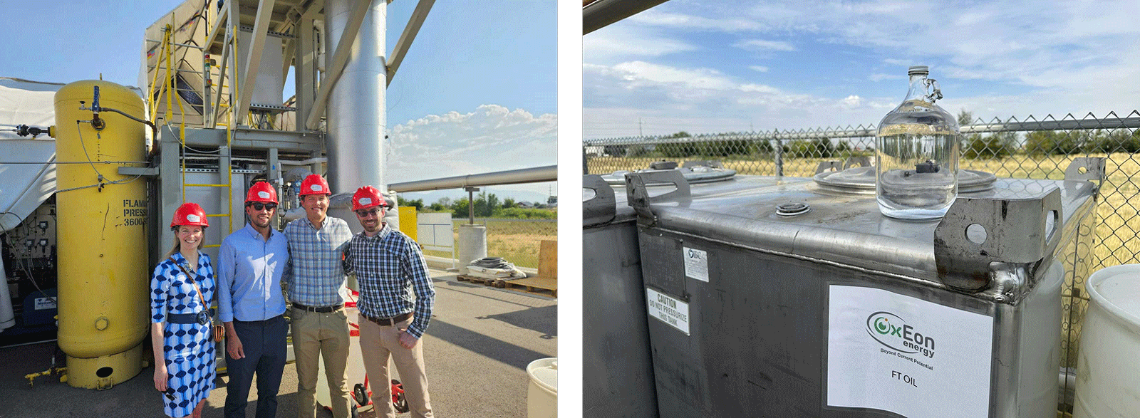 Left: RMI staff touring OxEon Energy’s Fischer Tropsch reactor for synthetic fuel production in North Salt Lake. Right: OxEon Energy Fischer Tropsch liquid fuel.