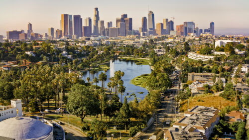 Aerial view of Echo Park Lake surrounded by neighbourhood with high rise office buildings in background, City Of Los Angeles, California, USA.