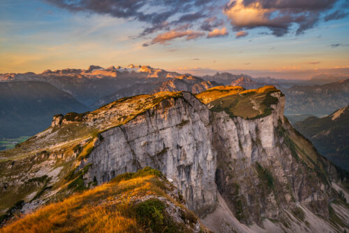 Rockface with Alpine Pasture high up in the Mountains in Austria in the Middle of the European Alps With Morning Sunlight Touching the Grass
