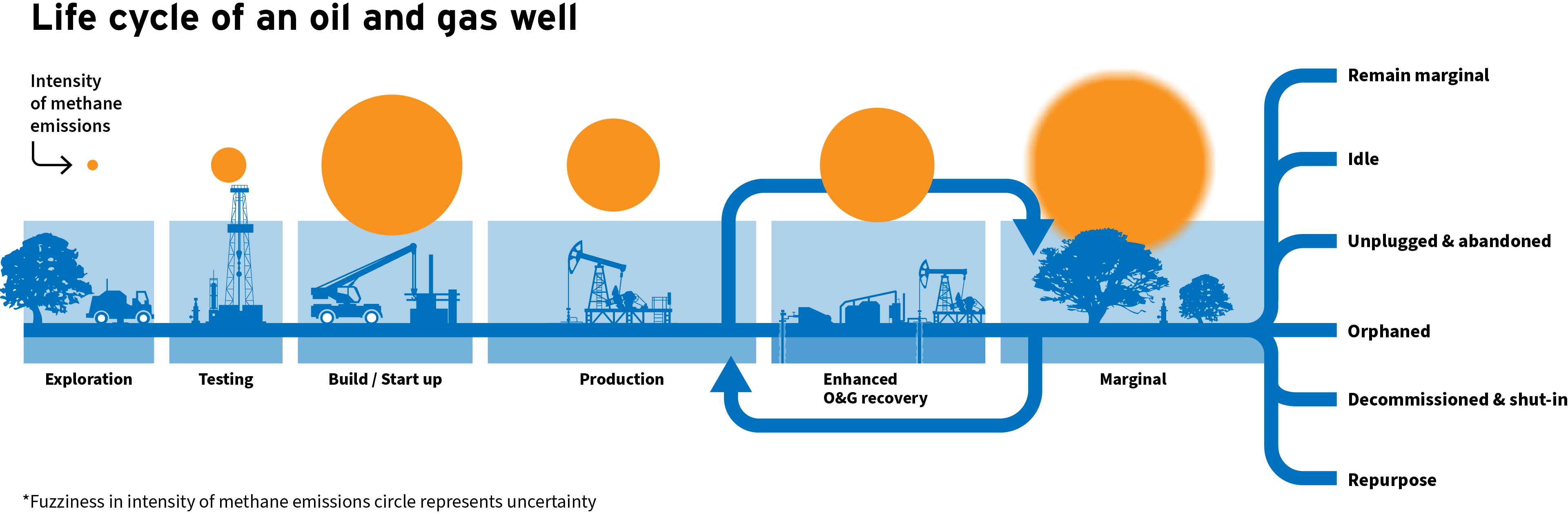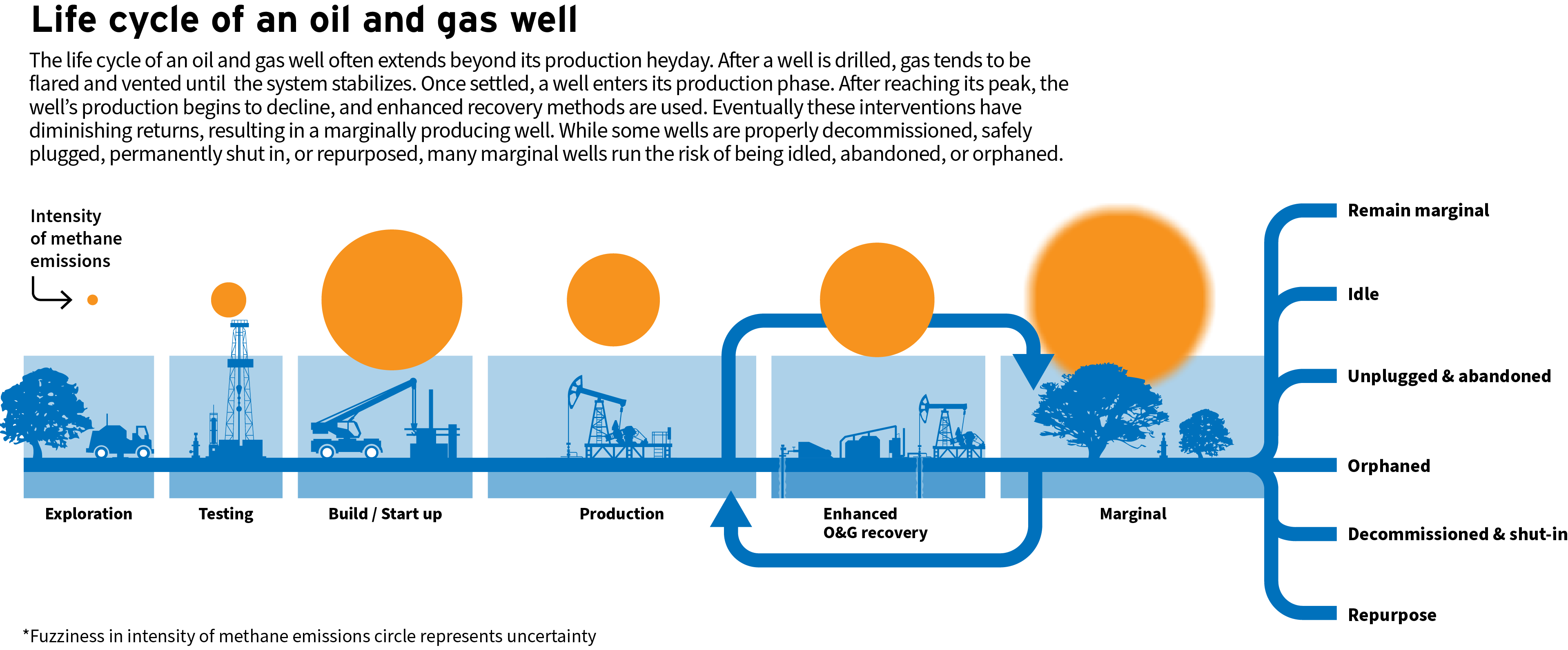The life cycle of an oil and gas well often extends beyond its production heyday. After a well is drilled, gas tends to be flared and vented until system pressures and volumes stabilize. Once the system settles, a well enters its decades-long production phase working toward its peak. After reaching its peak, the well’s production begins to decline, spurring operators to boost production, for example by injecting water or gas, fracturing wells, or using other enhanced recovery methods. Eventually these interventions to get more usable product from the well provide diminishing returns and the well’s production level drops until it is categorized as “marginal.”