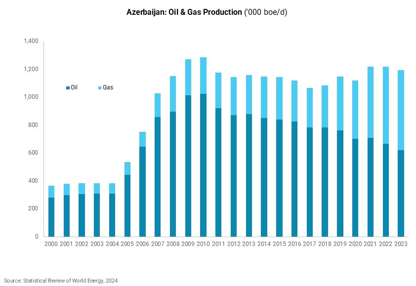 According to the Statistical Review of World Energy, Azerbaijan produced 620,000 barrels per day (b/d) of oil and 35.6 billion cubic meters (Bcm) of gas in 2023. Over the past decade, oil production has steadily declined, but rising gas production has compensated.