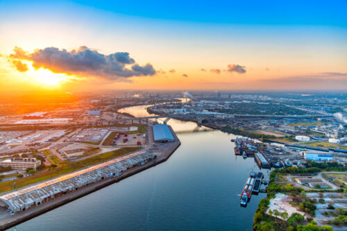 Texas refineries and other industry along the Buffalo Bayou dredged to form the Houston Ship Channel located about 4 miles east of downtown Houston, Texas shot aerially via helicopter from an altitude of about 500 feet at sunrise.