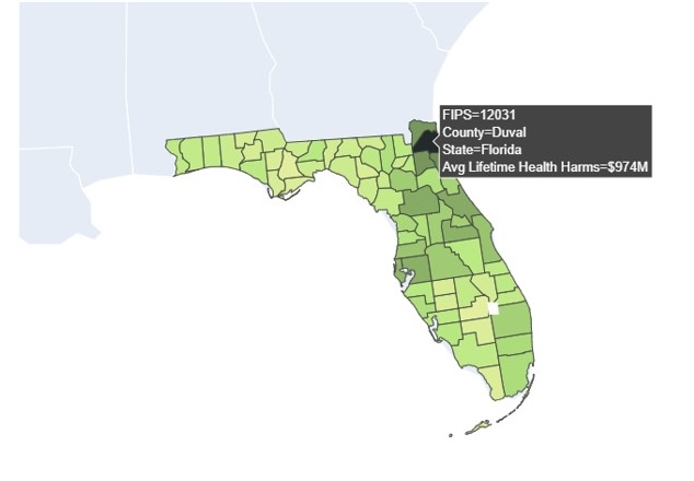 Total health-related economic impacts from the plant’s emissions are projected to exceed $2 billion in Florida, including ~$1 billion in Duval County alone. COBRA translates these effects into economic health costs, as well as specific outcomes like asthma cases, hospital visits, work/school days lost, and mortality.